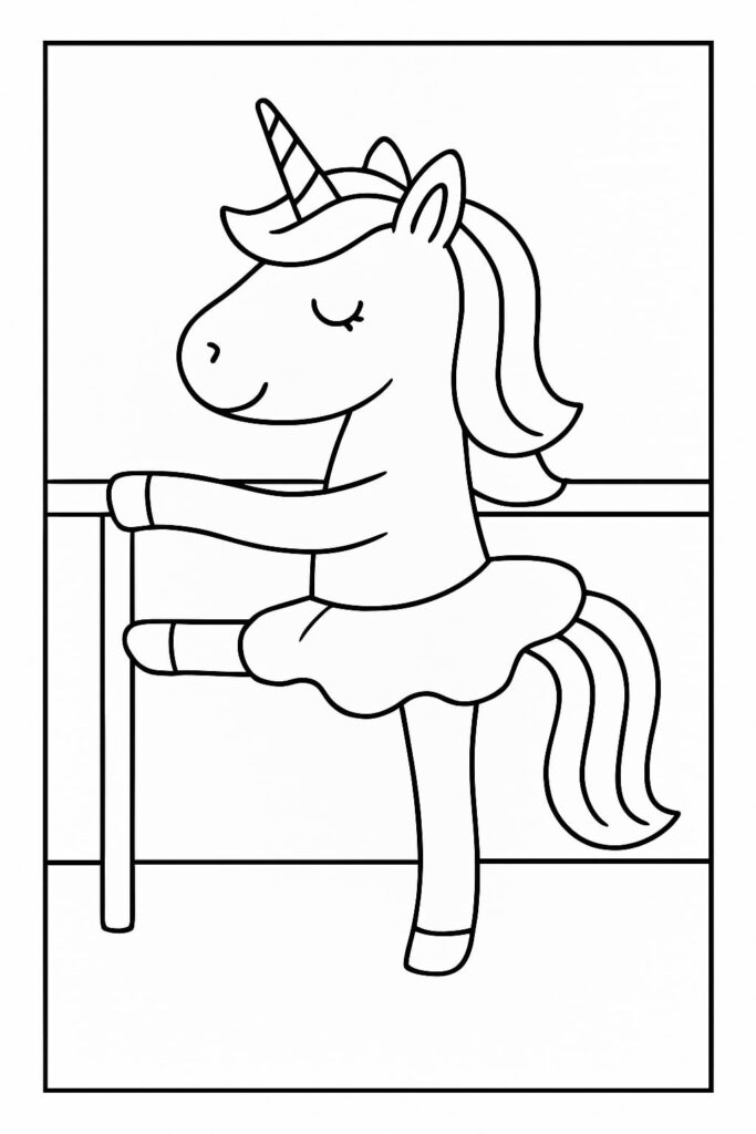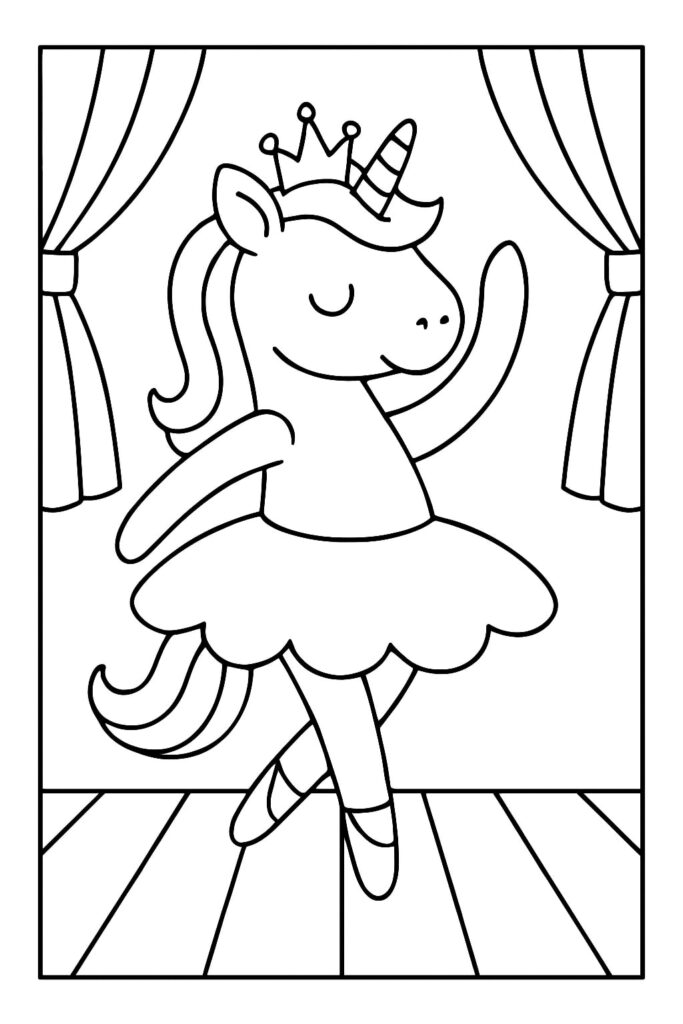 Print and color several ballerina unicorn pages. Staple them into a small book and write a short story about their magical dance adventures.