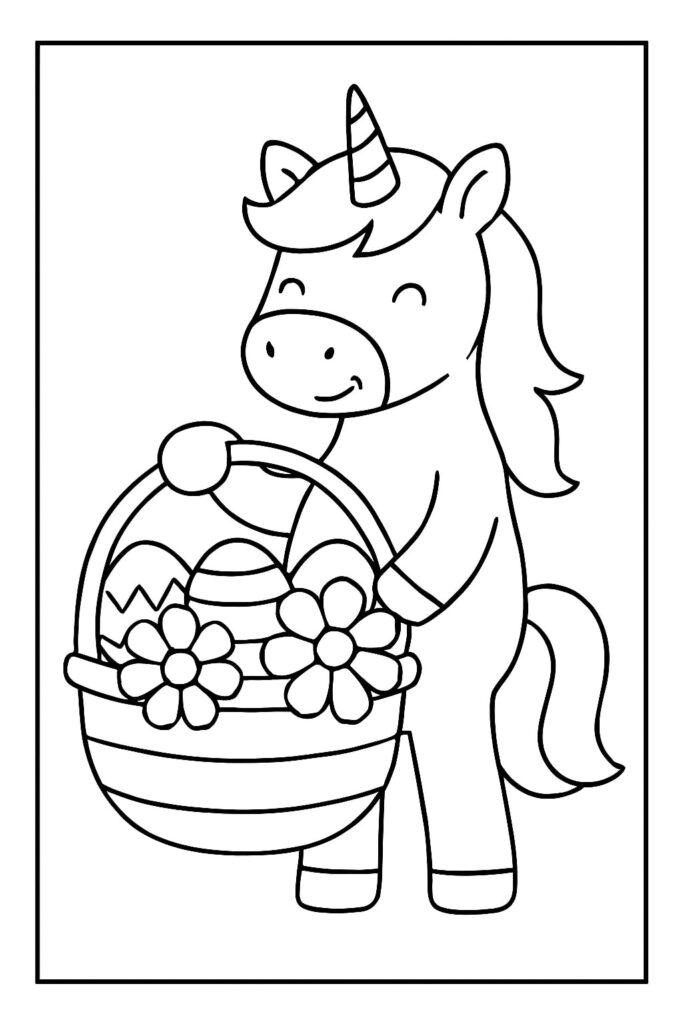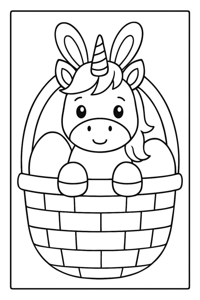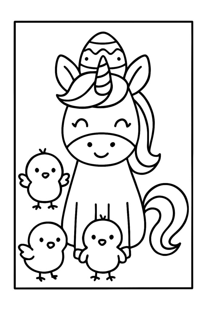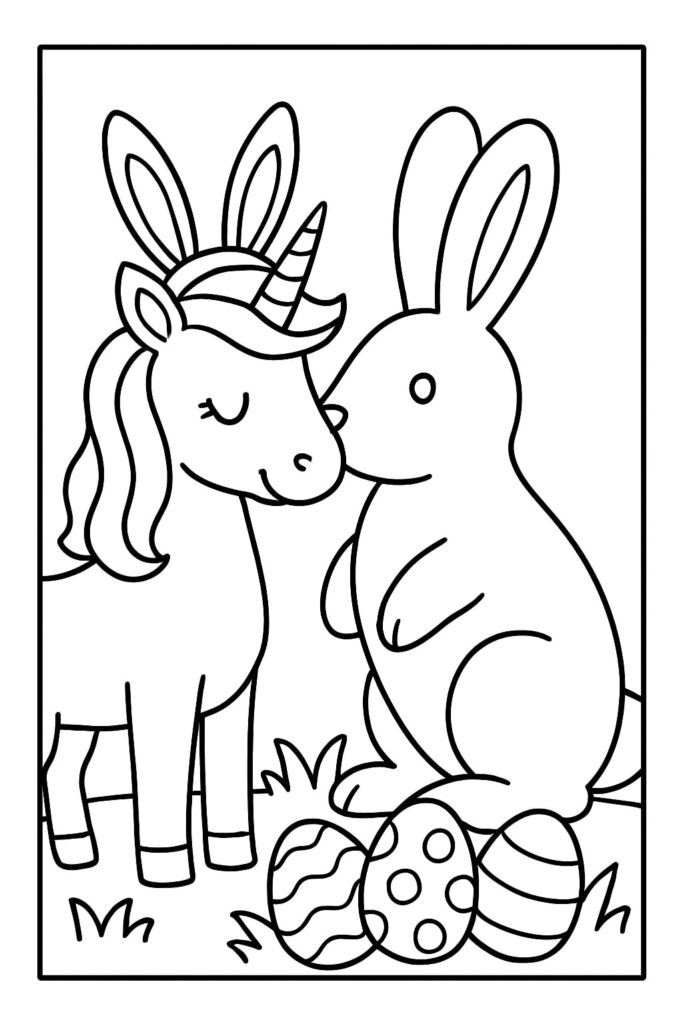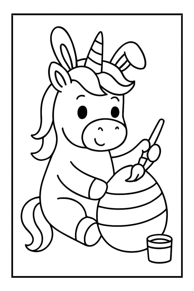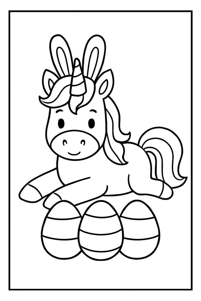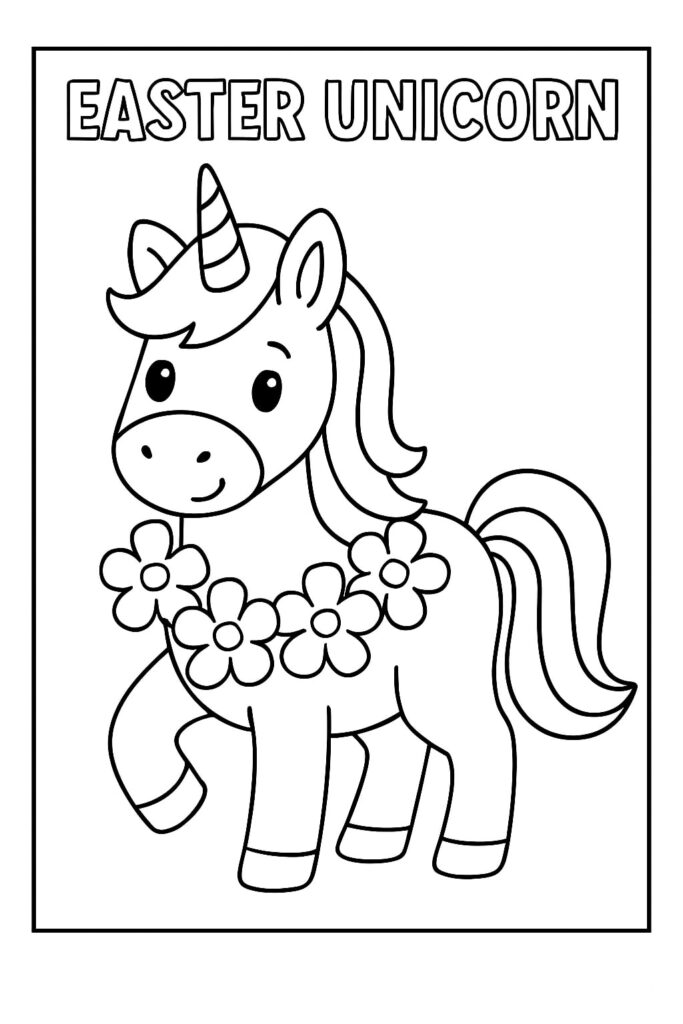 - Easter unicorn pages combine familiar spring icons (eggs, bunny ears) with magical manes—kids love the mix.
