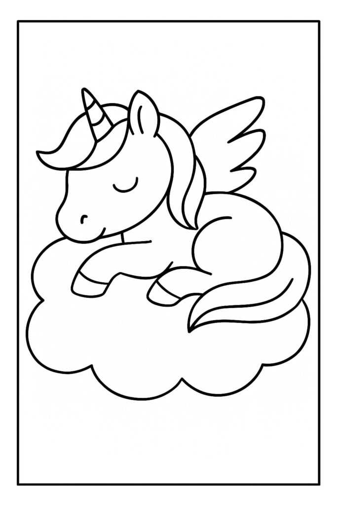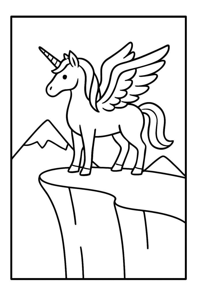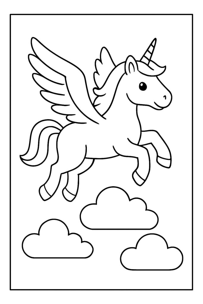 - Cloud Perches: A friendly winged unicorn sits among clouds and stars; the clean, chunky outlines are perfect for younger colorists.