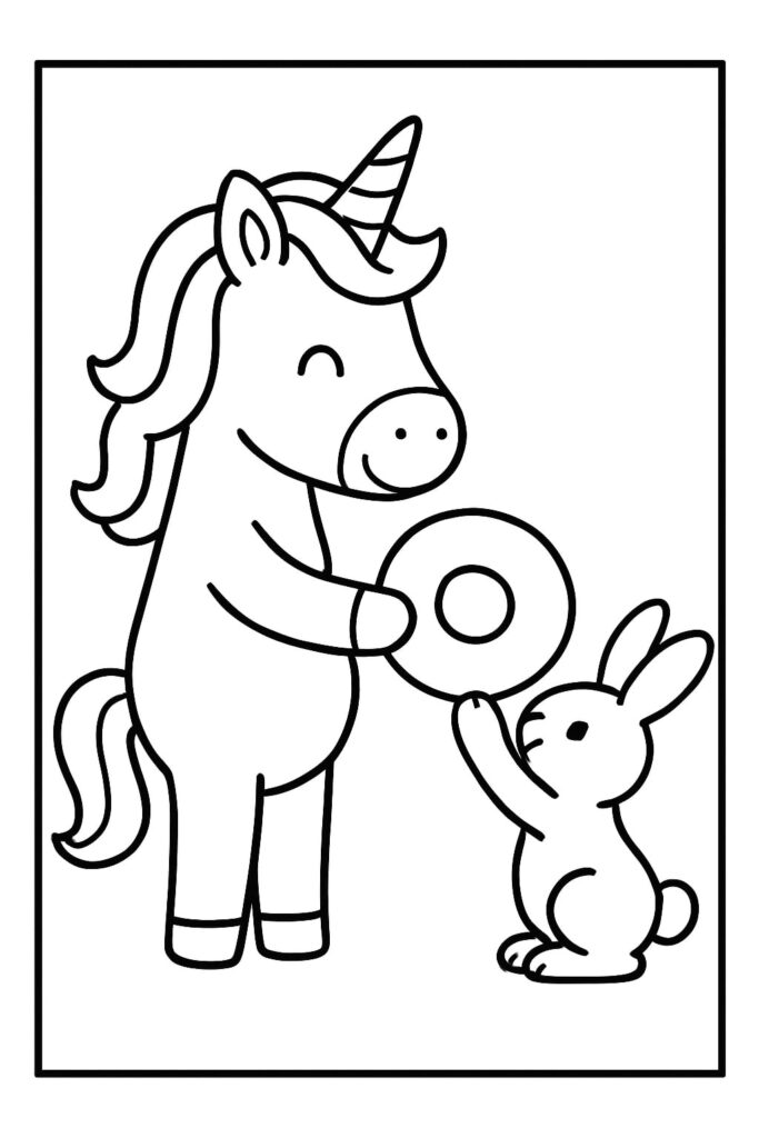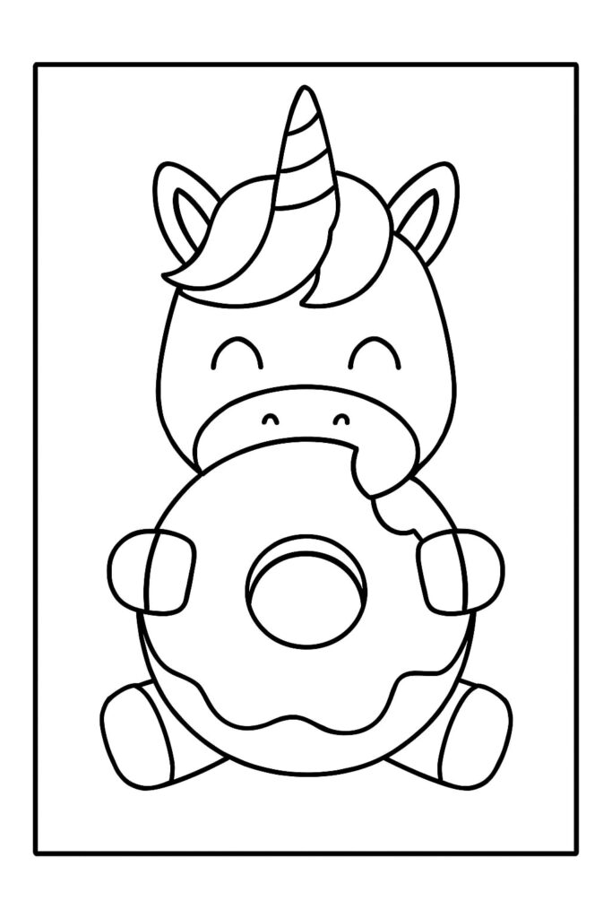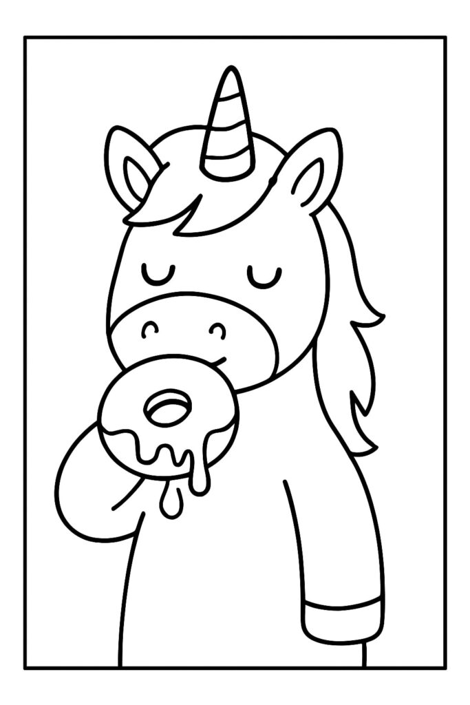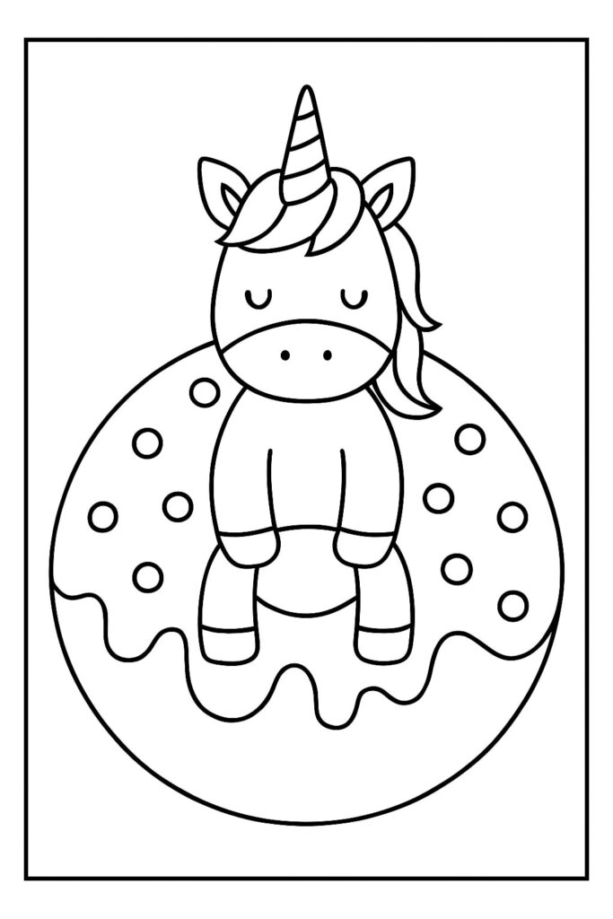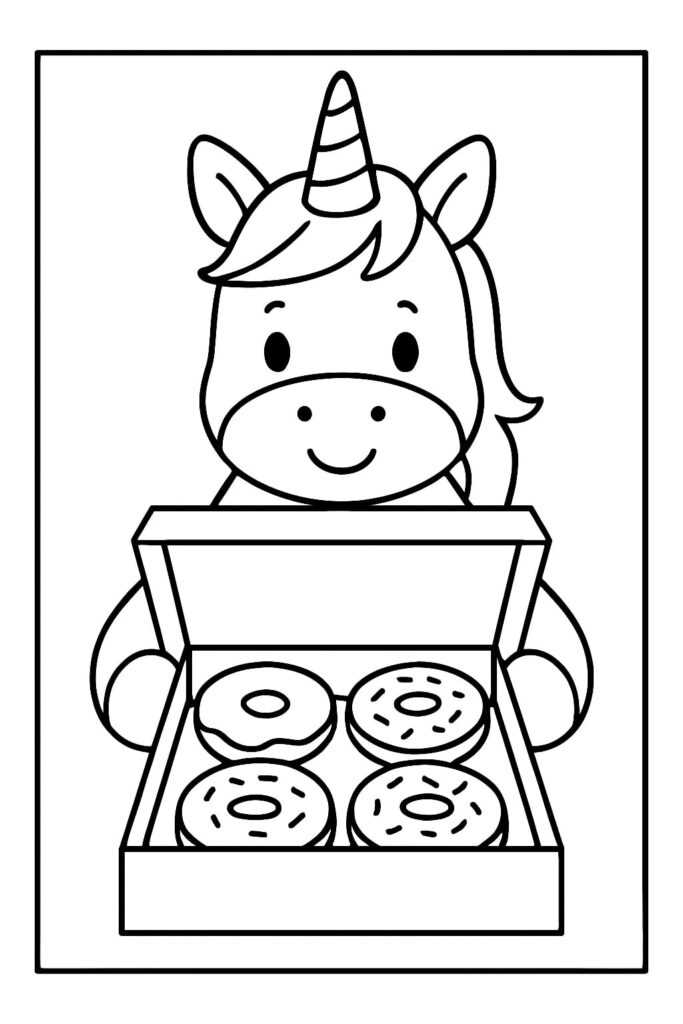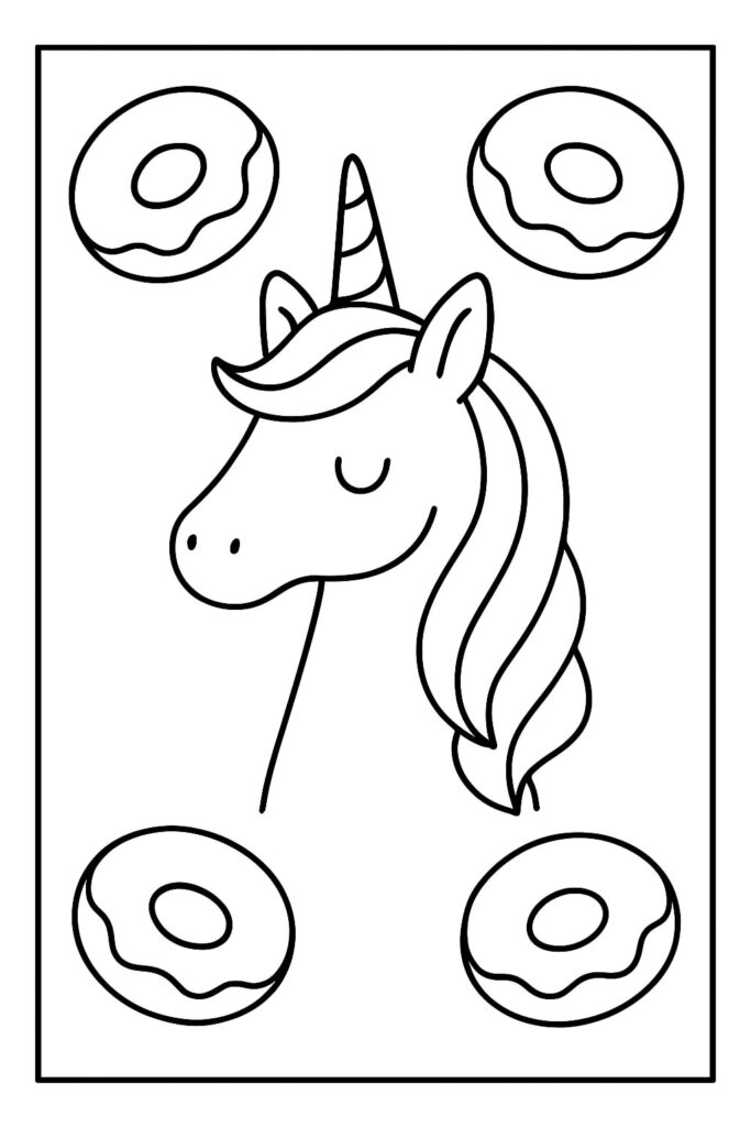 A unicorn donut coloring page blends a cute donut character with unicorn magic—think a frosted circle with a horn, ears, and sometimes a friendly face. The donut pairs with other fantasy favorites (unicorn cats, baby unicorns) or appears in a dessert parade with cake slices and cupcakes.