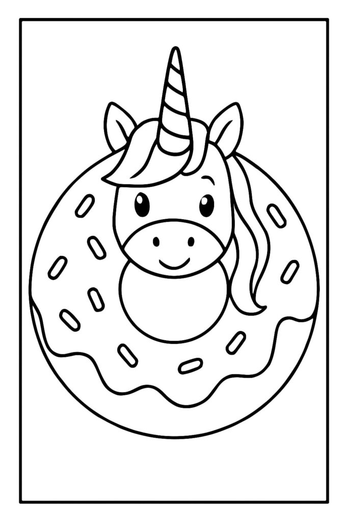 Choose easy unicorn donut for preschool designs with thick outlines, large frosting spaces, and simple faces. Offer triangle crayons or short coloring pencils to support a steady grip. Encourage kids to color the background first (broad confetti or stars), then move to the donut and horn to reduce scribble frustration.