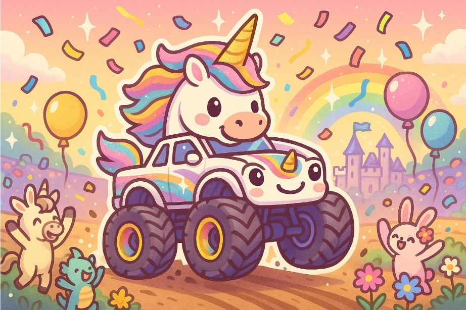 - Arena Scene: Stadium jumps, crushed cars, flags, and ramp silhouettes. Our monster-truck galleries include these backgrounds; swapping in unicorn colors or horn bands adds whimsy without losing the “vroom.”