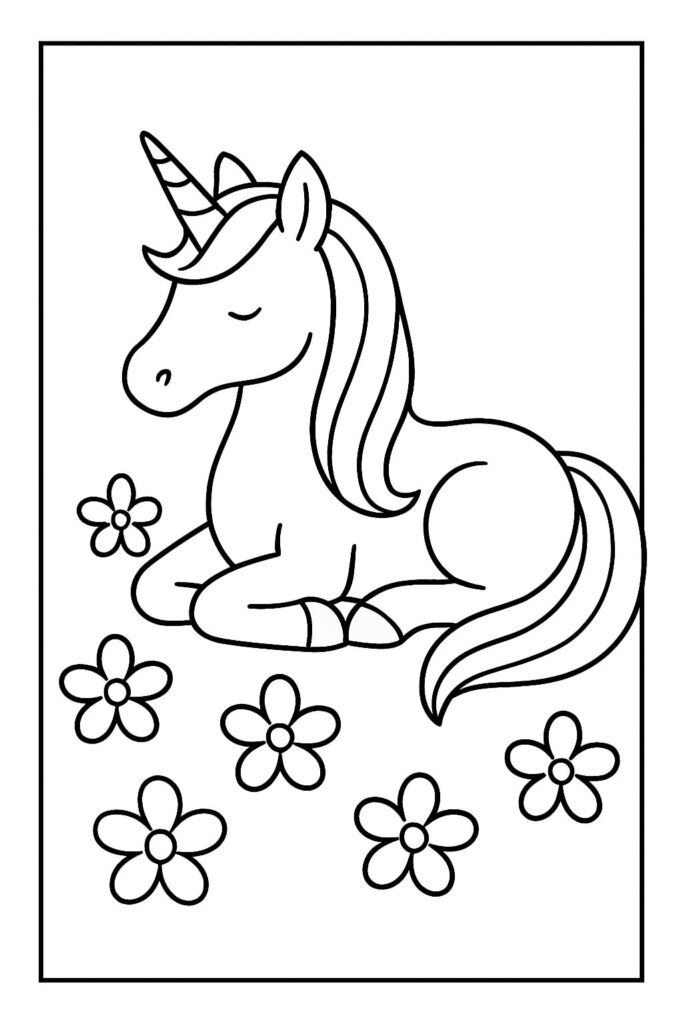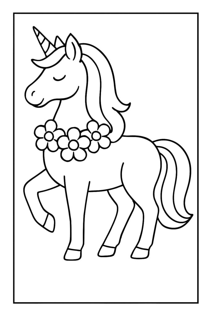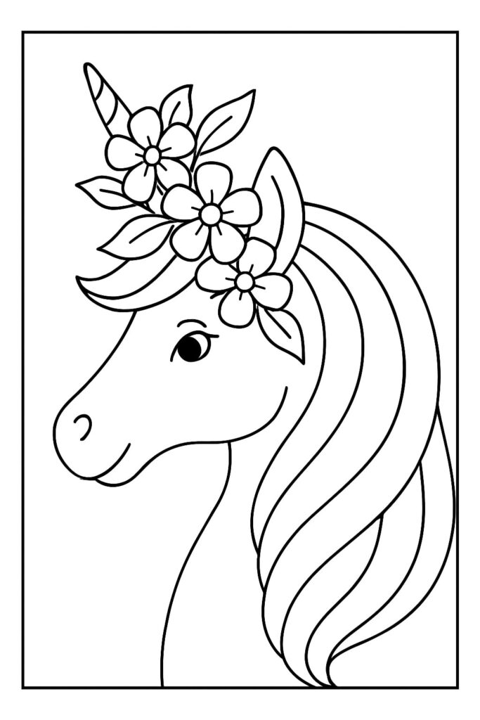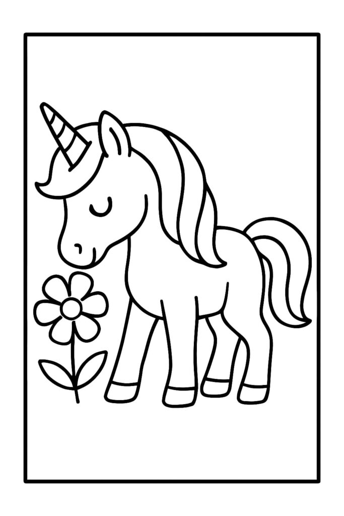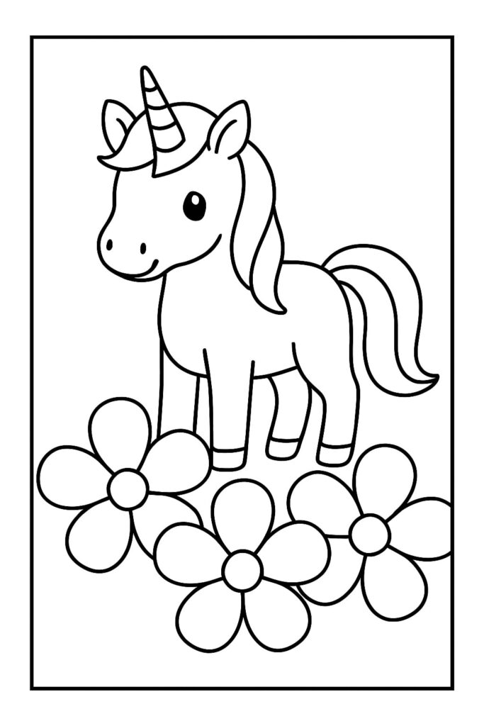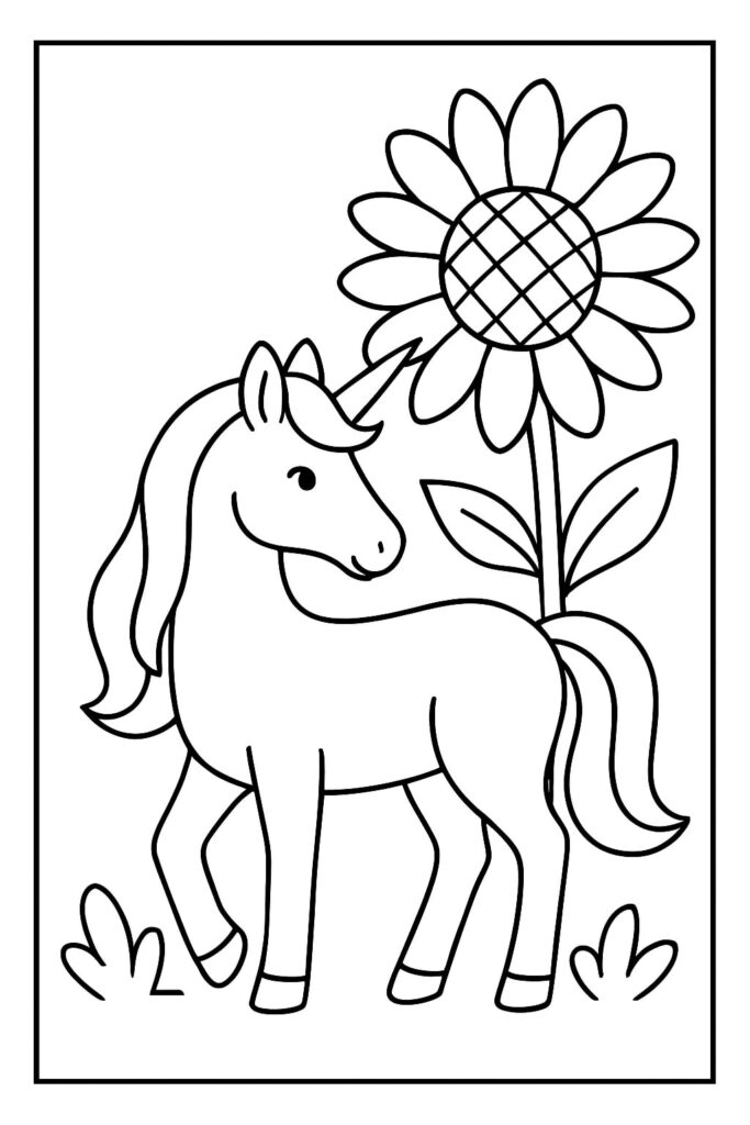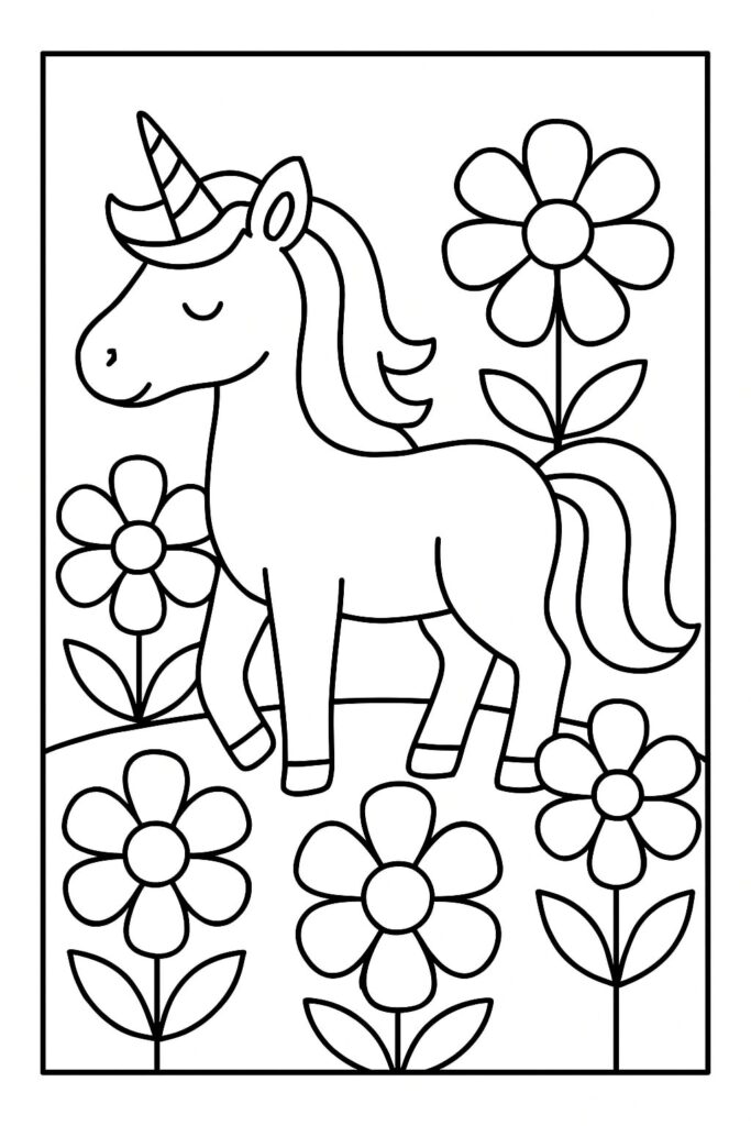 Pick easy unicorn with flowers for preschool pages with bold outlines and wide petals. Start with two colors for one minute to build confidence.